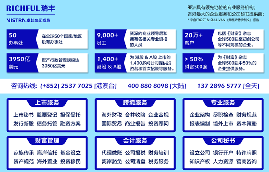 RICHFUL瑞丰系Vistra卓佳集团成员公司。作为领先的企业和私募基金客户关键业务专业服务机构,Vistra卓佳在全球50多个国家/地区设有办事处,拥有9000多名员工,服务实体超过20万家,资产行政管理规模达3950亿美元。客户包括1400家港股上市公司,50%名列《财富》杂志的500强企业及66% PEI 300全球领先私募股权投资机构。