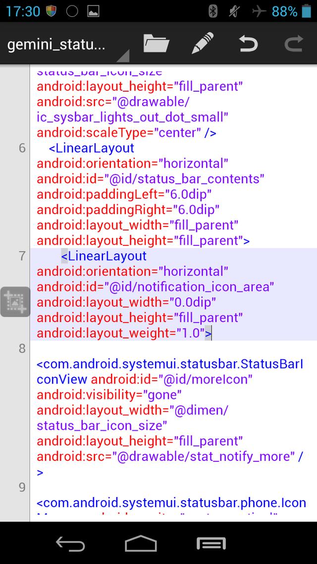 打开它,找到第一个LinearLayout的语句,这个就是状态栏控件布局的开头了。一般都是这个,还没见过哪个ROM用相对布局或是绝对布局去写状态栏布局的。